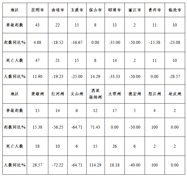 較大事故:昆明市1起、死亡3人,同比凈增加1起、3人;西雙版納州1起、死亡3人,同比凈增加1起、3人;大理州1起、同比持平,死亡8人、同比增加4人。