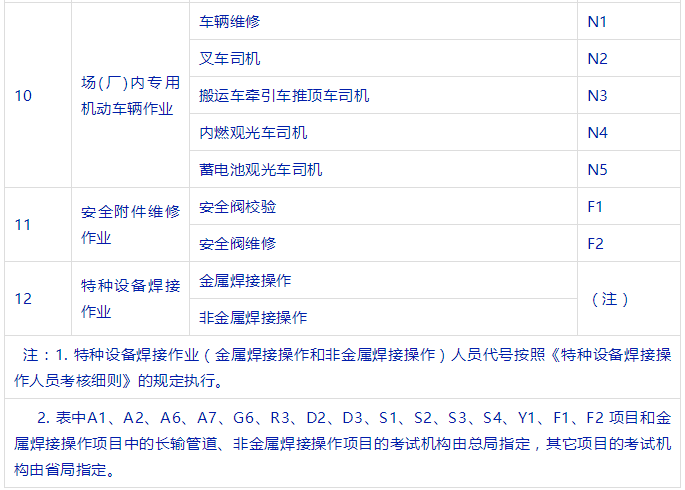 特種設(shè)備安全管理人員、叉車司機(jī)、起重機(jī)司機(jī)、起重機(jī)指揮、壓力容器、鍋爐、氣瓶充裝、電梯安裝與維修、觀光車、客運(yùn)索道操作與修理、大型游樂(lè)設(shè)施操作與維修等等。