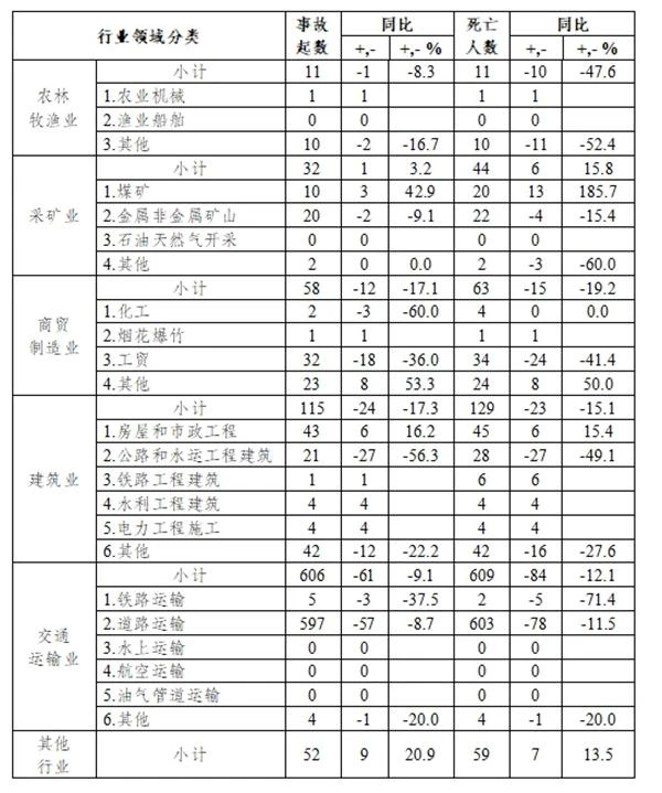 較大事故:煤礦事故3起、死亡12人,同比分別凈增加3起、12人;化工事故1起、死亡3人,同比凈增加1起、3人;工貿事故1起、同比持平,死亡3人、同比減少3人;房屋和市政工程事故1起、死亡3人,同比均持平;公路和水運工程建筑事故1起、同比持平,死亡8人、同比增加5人;鐵路工程建筑事故1起、死亡6人,同比分別凈增加1起、6人;道路運輸事故7起、死亡23人,同比分別減少5起、20人;其他行業(yè)事故2起、同比持平,死亡6人、同比減少2人。