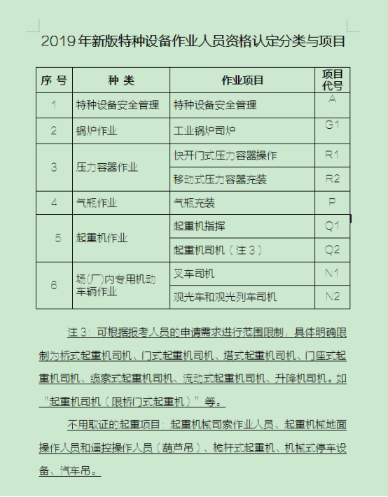 起重機指揮證(Q1)、橋式起重機司機 (Q2)、門式起重機司機(2)、塔式起重機司機(Q2)、門座式起重機司機(Q2)、升降機司機(Q2)、流動式起重機司機(Q2)、纜索式起重機司機 (Q2)。