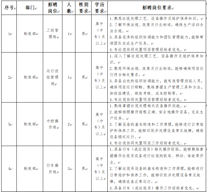 3.身體條件:身體健康,無恐高、高血壓等不適合一線生產(chǎn)崗位工作的疾病,具備一定的體力和耐力,能夠適應垃圾處理現(xiàn)場的工作環(huán)境。