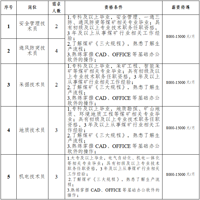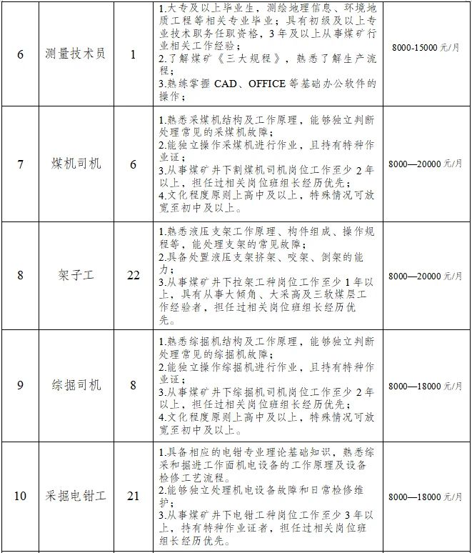 原則上年齡一般不超45周歲,特殊崗位技術(shù)人才可適當(dāng)放寬年齡至50周歲以內(nèi),但需個(gè)人確保到齡退休時(shí),養(yǎng)老保險(xiǎn)繳費(fèi)年限符合退休條件;持有井下相關(guān)操作技能等證書優(yōu)先考慮;身體健康,無相關(guān)職業(yè)禁忌癥。